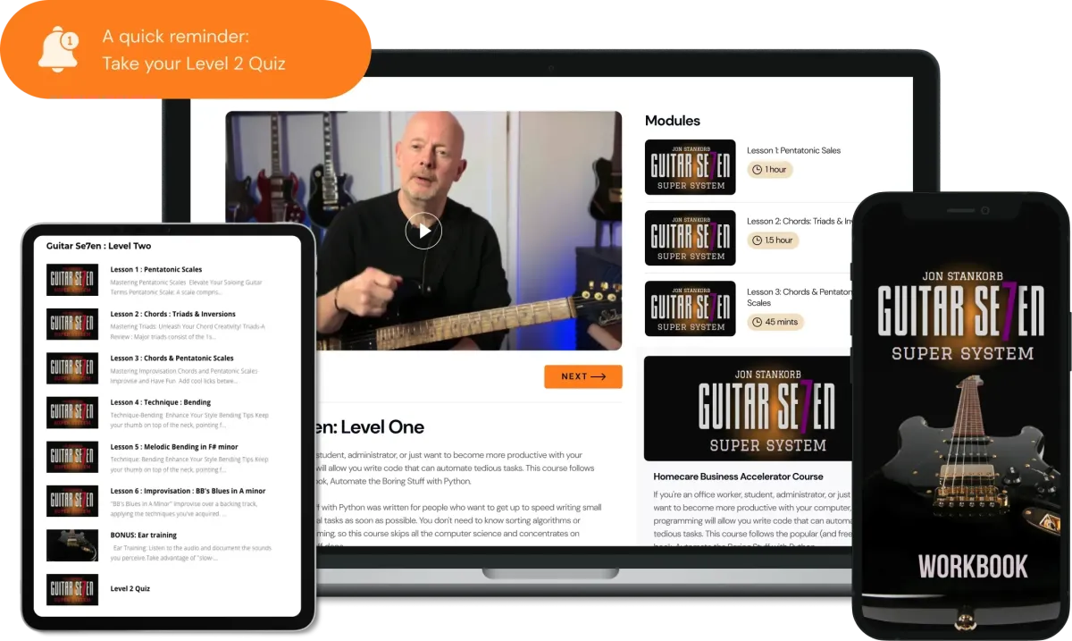 The "Guitar Se7en Super System" is a comprehensive journey designed to help you finally achieve guitar mastery. Whether you're feeling stuck, looking to pivot or simply seeking more confidence in your playing, the proven strategies within this course are your keys to unlocking a new level of success.